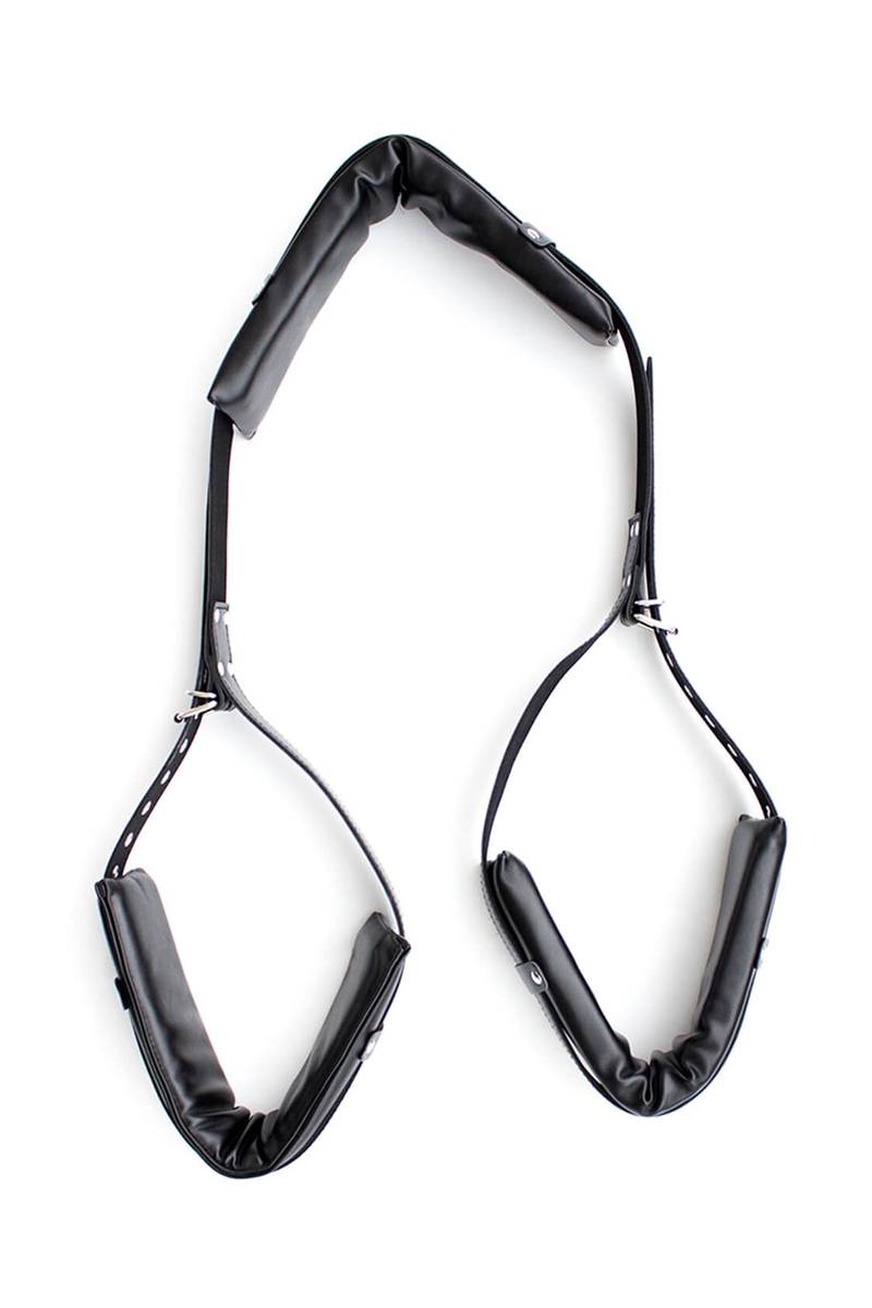 Magnifique contrainte pour cuisses et nuque, en PU et métal, permettant de garder sans effort les cuisses de votre partenaire relevées, en position de soumission sexuelle.