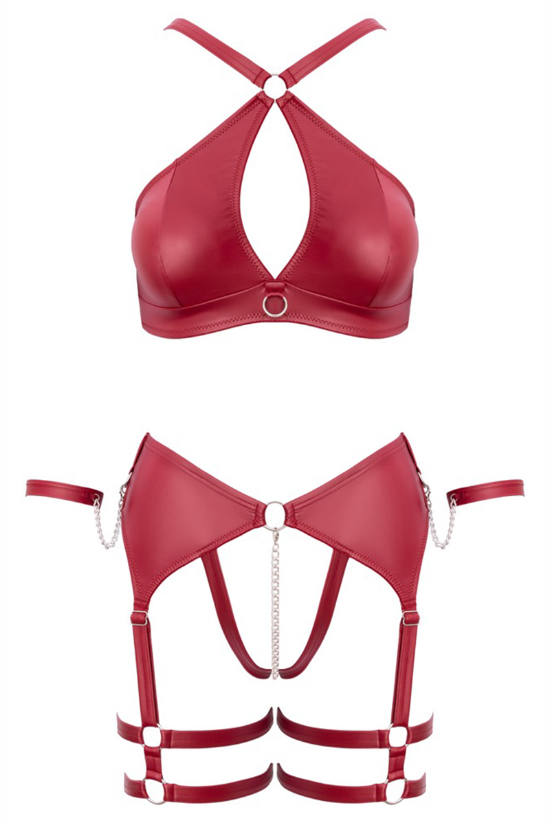 Cet ensemble de lingerie signé Cottelli BONDAGE se pare d’un magnifique rouge foncé mat, rehaussé d’accessoires argentés. Il est composé d’un soutien-gorge souple, d’un string ouvert avec porte-jarretelles et de menottes souples. Conçu dans une matière douce et entièrement élastique, il offre un confort absolu tout en sublimant votre silhouette.