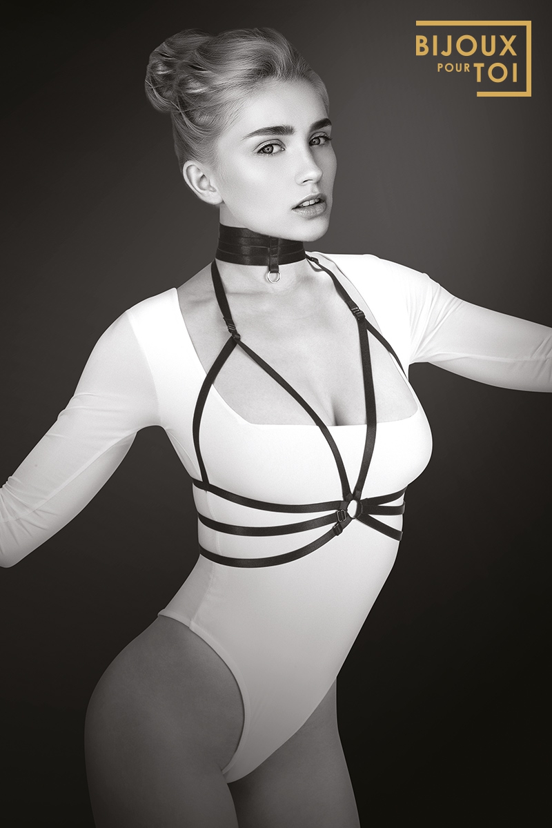 Le harnais Julia, de la marque Bijoux Pour Toi, est un harnais en deux parties: un harnais de buste de style Fetish SM soft, et un tour de cou assorti. L’ensemble est très tendance et glamour, et sublime votre poitrine et votre cou.