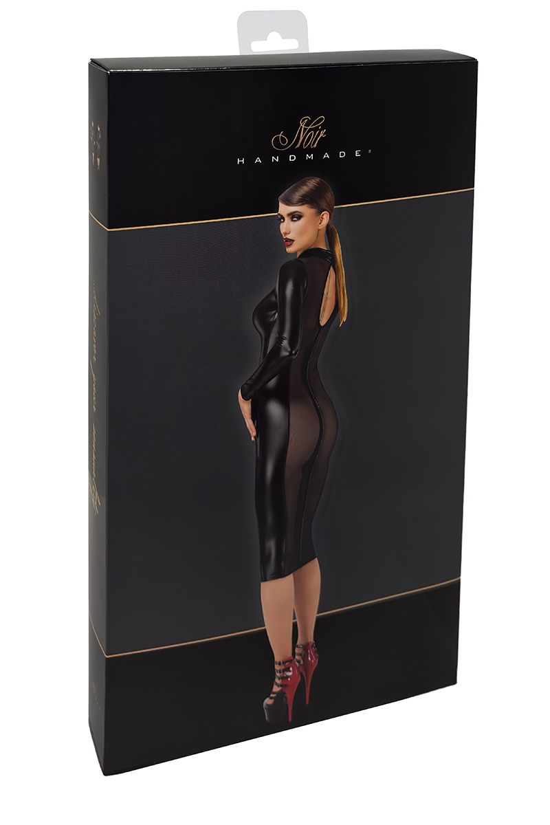 Matière : Confectionnée en powerwetlook lisse et tulle léger, cette robe épouse confortablement les formes du corps tout en offrant structure et élégance. L’association de matières opaques et transparentes crée un effet visuel captivant et une coupe flatteuse.